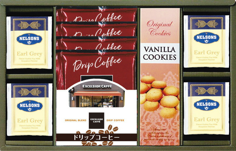| セット内容 | アールグレイ紅茶ティーバッグ(NELSONS)(2g)×12、ドリップコーヒーモカブレンド(10g)×4、クッキー(バニラ)(30g)×1 |