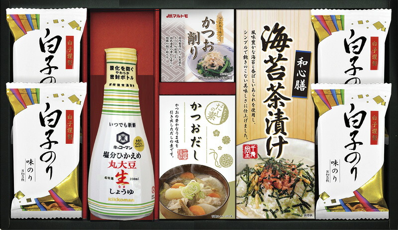 | セット内容 | 白子のり味のり(8切5枚)×4、キッコーマン塩分ひかえめ丸大豆生しょうゆ(200ml)・海苔茶漬け(6g×5)・かね七かつおだし(4g×5)・マルトモかつおパック(0.7g×3)×各1 |