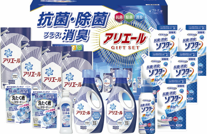 | セット内容 | 抗菌消臭ソフターEX詰替用(350g)×5、P&Gアリエールジェル詰替用(500g)×4、P&Gアリエールジェル(750g)・洗たく槽クリーナー(100g)×各2、抗菌消臭ソフターEX(400g)・台所用除菌ジェル(250ml)×各1 |