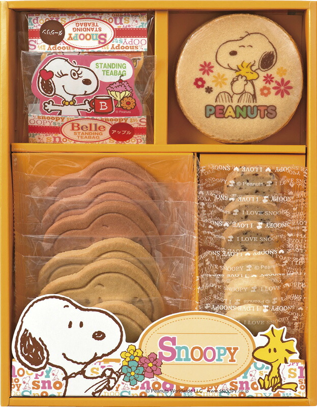 スヌーピーのきょうだいが一緒にプリントされたクッキーをはじめ、スヌーピーの形の可愛いクッキーと紅茶が入ったスヌーピーづくしの詰合せ。紅茶のタグはカップのフチにかけることができるのでスヌーピーやベルも一緒にティータイムの仲間になっているような楽しさいっぱいのセットとなっています。