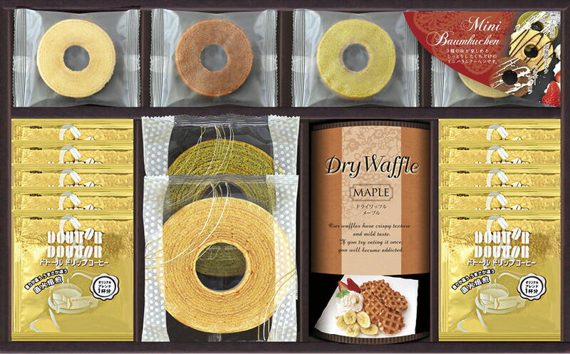 セット内容 ドトールドリップコーヒー×10、ミニバウムクーヘン(北海道生クリーム)×2、バウムクーヘン(ミルク・宇治抹茶)・ミニバウムクーヘン(ベルギーショコラ・宇治抹茶)・ドライワッフル(メープル6枚入)×各1