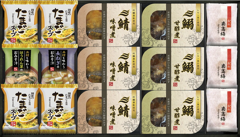 | セット内容 | たまごスープ(6.4g)×4、三陸産鯖の味噌煮・三陸産鰯の甘酢煮(各100g)・紀州南高梅(塩分8%・はちみつ)×各3、具材を味わうおみそ汁長ねぎ(7.8g)・具材を味わうおみそ汁ほうれん草×各1 |