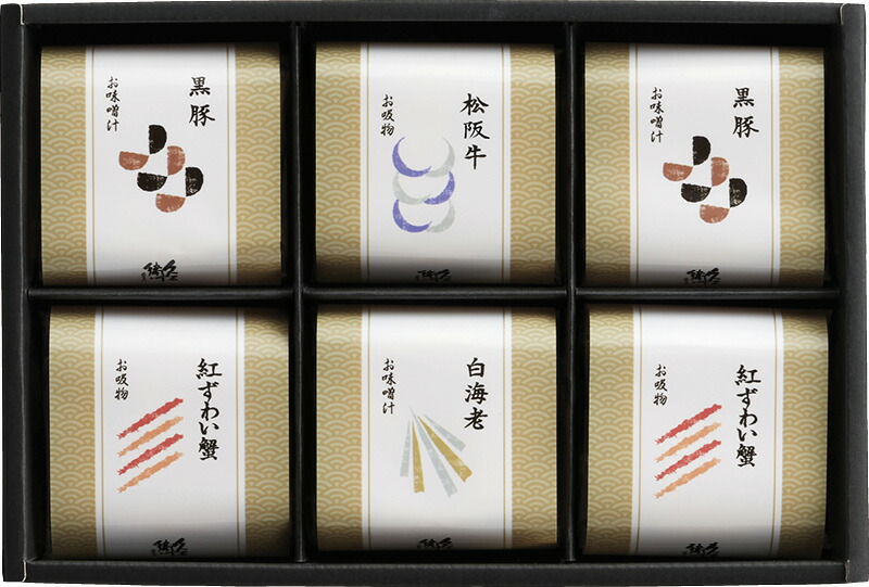 | セット内容 | 本格和風だしお吸物(紅ずわい蟹)・本格和風だしお味噌汁(黒豚)×各2、本格和風だしお吸物(松阪牛)・本格和風だしお味噌汁(白海老)×各1 |