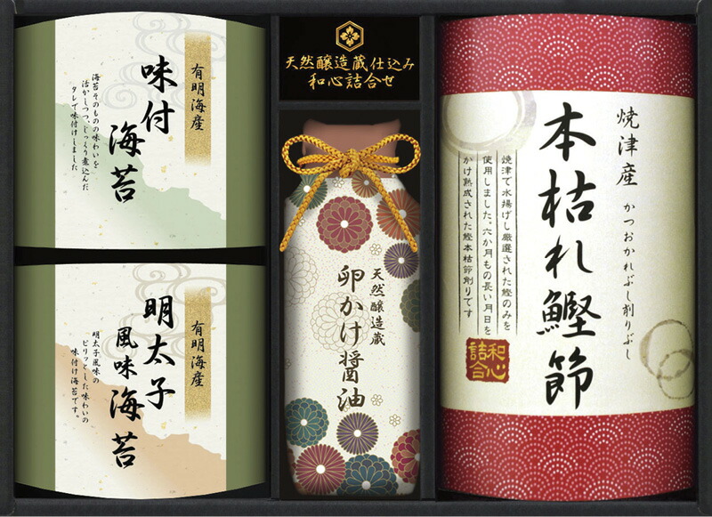| セット内容 | 有明海産(味付海苔・明太子風味海苔)(各8切8枚)・天然醸造蔵仕込み卵かけ醤油(200ml)・焼津産本枯れ鰹節(15g)×各1 |