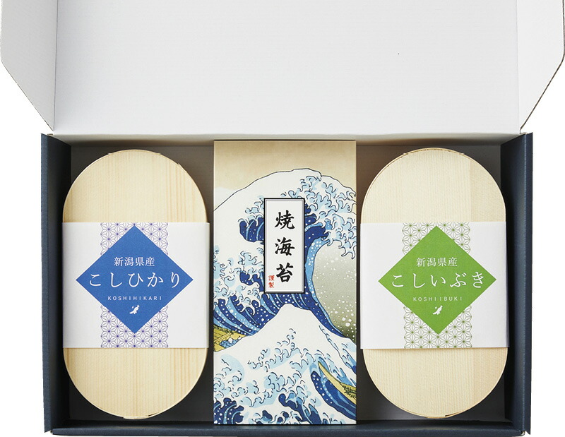 | セット内容 | 新潟県産こしひかり(無洗米)・新潟県産こしいぶき(無洗米)(各300g)・焼海苔(全型5枚)×各1 |