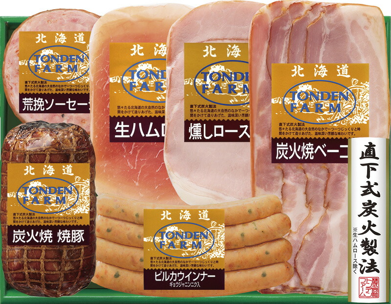 【ラッピング無料】北海道トンデンファーム TF-5B 炭火焼焼豚 ピルカウインナー 炭火焼ベーコン 荒挽ソーセージ 燻しロースハム 生ハムロース