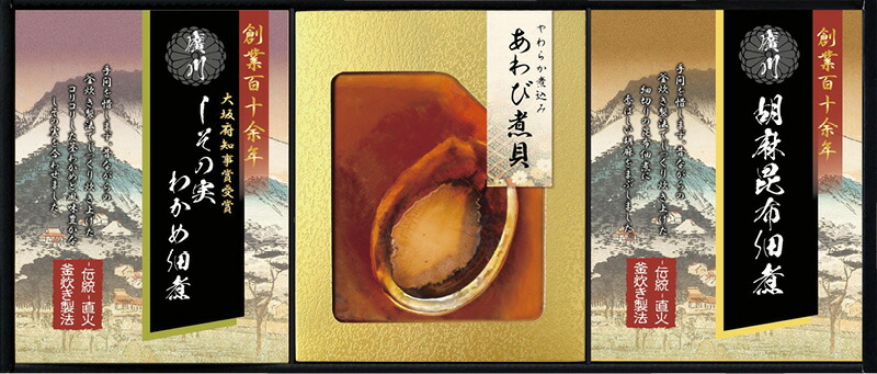 あわびをじっくりと煮上げた「あわびの煮貝」は、ふっくらやわらかく仕上げ、あわびの豊潤な香りをお楽しみいただけます。創業百十余年の廣川昆布の佃煮や、といだお米と一緒に炊くあわびも入った炊き込みご飯の素とセットになった高級贈答品となっています。