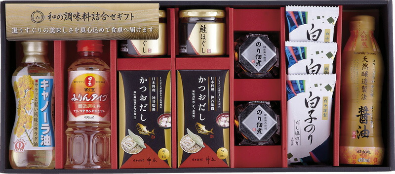 | セット内容 | 白子味のり だし塩のり(8切5枚)×3、のり佃煮瓶詰(80g)・鮭ほぐし(50g)・かつおだし(4g×8)×各2、伊賀越天然醸造醤油(シュリンク)(450ml)・日の出割烹みりんタイプ(400ml)・昭和キャノーラ油(300g)×各1 |