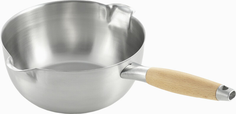 丈夫でお手入れの楽なステンレス製の雪平鍋に特徴的な口形状を付けました。移し替えでこぼれたり垂れたりしないので、きれいに注ぐことができます。汁物・煮物の移し替えに便利です。本体は煮汁がまんべんなく対流し、美味しさが引き出せるように程よい丸さを持った形状です。取っ手は握りやすいカーブに設計。手になじみやすく、優しい温もりの木製。ステンレスプラス木の風合いがお互いの質感を魅力的に引き立てます。IH対応。