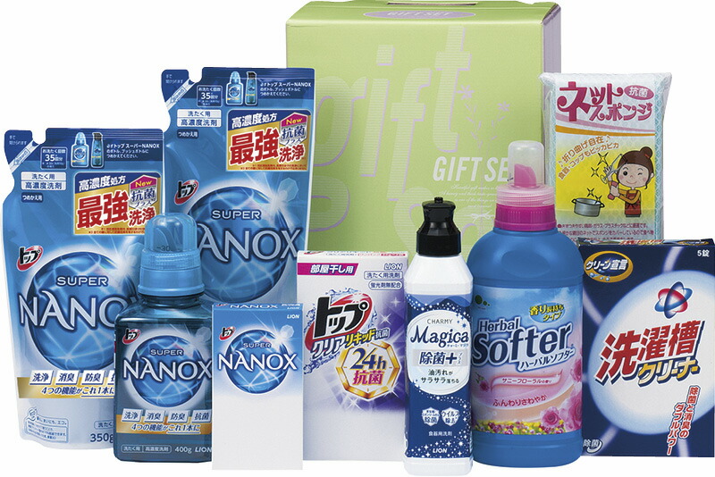 | セット内容 | ライオントップスーパーナノックス詰替用(350g)×2、ハーバルソフター香り長持ちS(450ml)・ライオントップスーパーナノックス(400g)・ライオンCHARMY Magica除菌+(220ml)・ライオントップクリアリキッド抗菌(25g×2袋)・ライオントップスーパーナノックス(10g×3袋)・洗濯槽クリーナー(5錠)・ネットスポンジ(中国)×各1 |