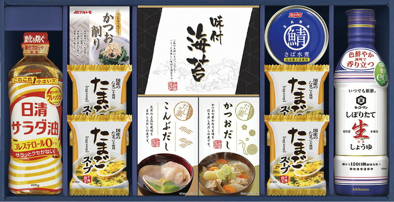 セット内容 たまごスープ(6.4g)×4、キッコーマンしぼりたて生しょうゆ(450ml)・日清サラダ油(400g)・ニッスイさば水煮(150g)・有明海産味のり(8切8枚×2)・かね七(かつおだし・こんぶだし)(各4g×5)・マルトモかつおパック(0.7g×3袋)×各1