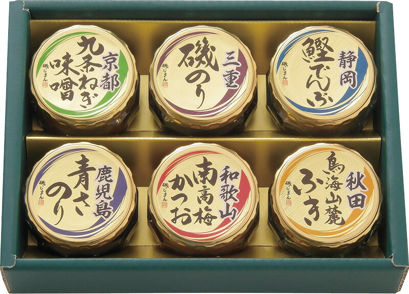| セット内容 | 京都九条ねぎ味噌・三重磯のり・鹿児島青さのり・和歌山南高梅かつお(各90g)・静岡鰹でんぶ・秋田鳥海山麓ふき(各45g)×各1 |