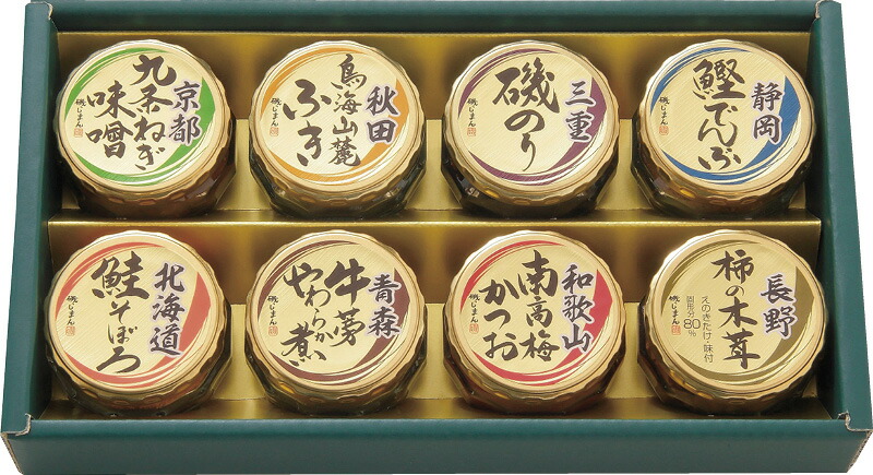 | セット内容 | 京都九条ねぎ味噌・三重磯のり・和歌山南高梅かつお(各90g)・長野柿の木茸(85g)・青森牛蒡やわらか煮(55g)・秋田鳥海山麓ふき・静岡鰹でんぶ(各45g)・北海道鮭そぼろ(40g)×各1 |