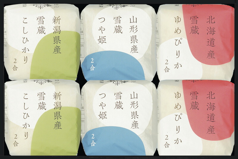 | セット内容 | 新潟県産こしひかり・山形県産つや姫・北海道産ゆめぴりか(各2合)×各2 |