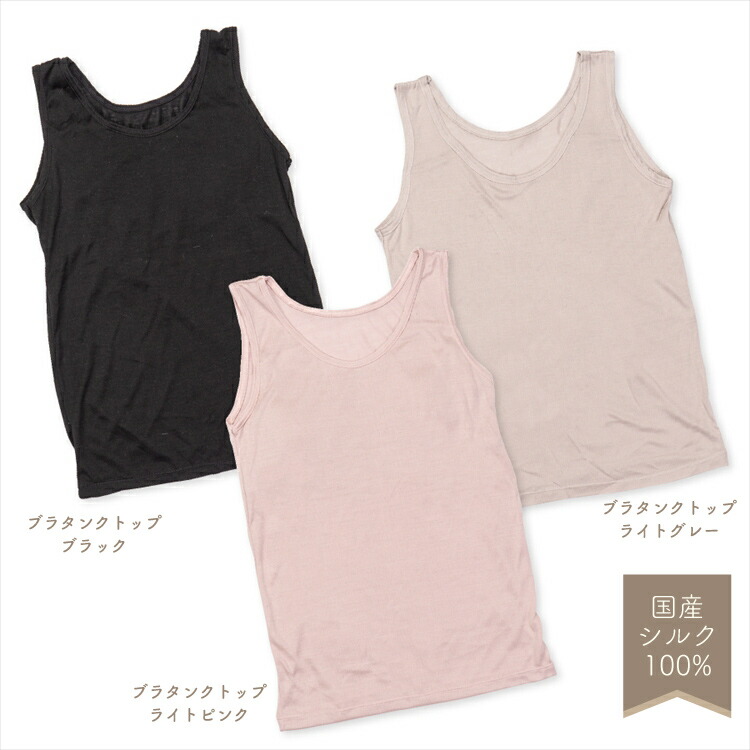 シルクを100%使用したナイトブラタンクトップ(パッドつき)+スタンダードショーツ カラー ブラック、ライトグレー、ライトピンク サイズ 〇ナイトブラタンクトップ Mサイズ 着丈52cm(総丈58cm…
